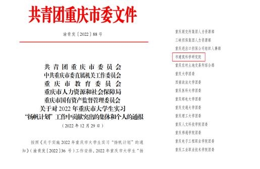 近日,市委直屬機(jī)關(guān)工委、市教委、市人力社保局、市國資委、團(tuán)市委對在 2022 年重慶市大學(xué)生實(shí)習(xí)“揚(yáng)帆計(jì)劃”工作中做出突出貢獻(xiàn)的 97 個(gè)組織、 95 名工作者以及表現(xiàn)出色的220 名優(yōu)秀學(xué)生進(jìn)行了通報(bào)。其中,重慶市建筑科學(xué)研究院有限公司(以下簡稱公司)獲得貢獻(xiàn)突出組織稱號,公司黨委辦公室實(shí)習(xí)學(xué)生程慶(重慶交通大學(xué))獲得表現(xiàn)出色個(gè)人稱號。