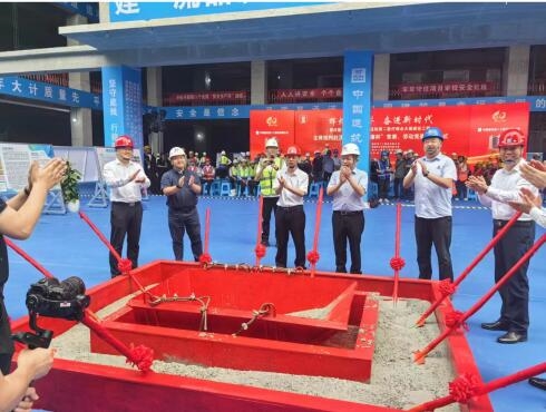 在活動(dòng)現(xiàn)場,參建各方代表在施工現(xiàn)場為封頂樓層鏟最后一方混凝土,并對奮戰(zhàn)在第一線的作業(yè)工人進(jìn)行慰問。