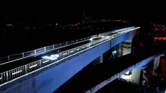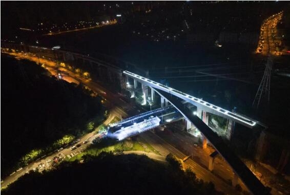 為最大程度減少對運營線路的影響,縮短建設工期,保障施工安全,項目部決定采用橋梁轉體工藝進行施工,即在6號線兩側將T構連續(xù)梁澆筑完成,以橋墩為軸逆時針轉體,跨越既有6號線進行對接。7月28日1時56分,6號線東延工程劉家坪站至百樂園站高架區(qū)間的兩座T構連續(xù)梁轉體橋開始轉體施工,經過52分鐘的轉體作業(yè)后,實現精準對接,這既是6號線東延工程高架區(qū)間首座連續(xù)梁轉體,也是重慶軌道交通領域首次實現連續(xù)梁跨越既有軌道交通線路轉體,為后續(xù)類似施工提供了范本。