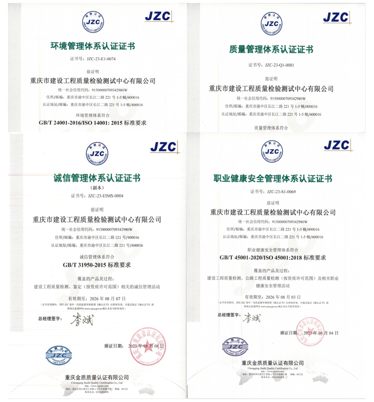 近日,經(jīng)過(guò)質(zhì)量、環(huán)境、職業(yè)健康安全、誠(chéng)信管理體系現(xiàn)場(chǎng)評(píng)審,重慶設(shè)計(jì)集團(tuán)市建科院公司所屬子公司——重慶市建設(shè)工程質(zhì)量檢驗(yàn)測(cè)試中心有限公司(簡(jiǎn)稱檢測(cè)中心)順利通過(guò)2023年度ISO資質(zhì)再認(rèn)證評(píng)審。