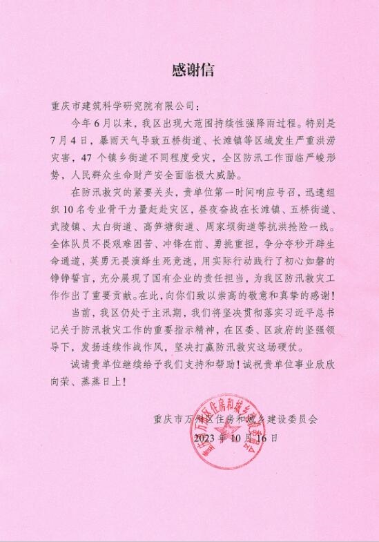 近日,重慶市建筑科學(xué)研究院有限公司收到來自重慶市萬州區(qū)住房和城鄉(xiāng)建設(shè)委員會的感謝信,信中對市建科院在今年7月萬州暴雨災(zāi)后防汛救災(zāi)工作中所做出的貢獻致以敬意和感謝。