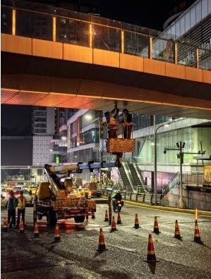 天橋位于商業(yè)區(qū),天橋上下人流、車(chē)流量較大,且天橋外側(cè)加裝了鋁板裝飾層,無(wú)形中為現(xiàn)場(chǎng)檢測(cè)工作帶來(lái)了難度。為盡快完成本次檢測(cè),同時(shí)減少現(xiàn)場(chǎng)檢測(cè)工作給游客及交通帶來(lái)的影響,本次檢測(cè)選擇在夜晚進(jìn)行。我司組織了在檢測(cè)、鑒定領(lǐng)域具有豐富經(jīng)驗(yàn)的專(zhuān)家及檢測(cè)人員進(jìn)駐現(xiàn)場(chǎng),在最短時(shí)間完成了檢測(cè)方案編寫(xiě)、天橋計(jì)算分析、交通占道方案審批、現(xiàn)場(chǎng)檢測(cè)工作準(zhǔn)備以及橋梁外觀(guān)檢查、靜載和動(dòng)載試驗(yàn)以及欄桿推力試驗(yàn),圓滿(mǎn)完成檢測(cè)任務(wù),為天橋結(jié)構(gòu)的安全提供了有力的技術(shù)保障,為橋上打卡游客的人身安全保駕護(hù)航。